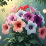Seven different varieties of Statice flowers displayed together with detailed petals and leaves, surrounded by gentle light effects symbolizing their spiritual meanings.