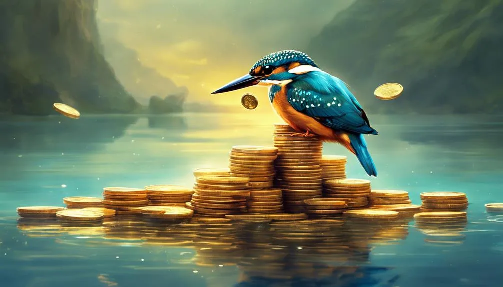 Beyond its tranquil beauty, the kingfisher bird also emerges as a potent symbol of prosperity, inviting you to explore the wealth and abundance it represents. This vibrant creature, with its dazzling colors and swift movements, isn't just a delight for the eyes but a beacon for wealth attraction. Its presence in your life or dreams might signal that it's time to open your heart and mind to opportunities for financial growth and stability.