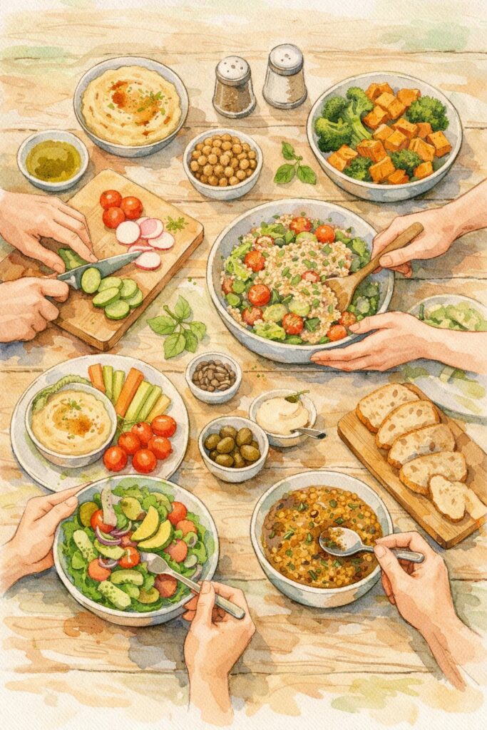 You don’t have to go gourmet. Meals like veggie tacos, pasta with tomato sauce, or grilled cheese sandwiches totally work. Black bean quesadillas and cheese pizza? Those are always a hit.