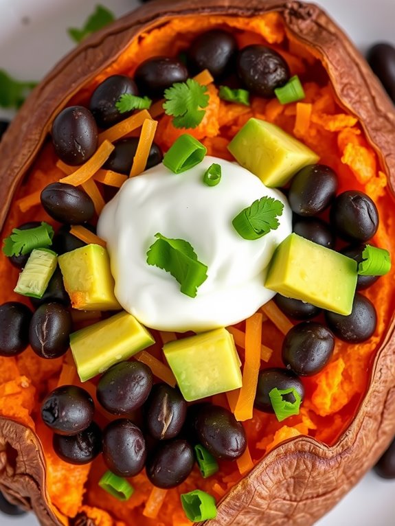 To elevate the dish, you can add toppings like black beans, avocado, and a tangy yogurt dressing that complements the spiced sweet potatoes beautifully. This dish isn’t only visually appealing but also incredibly nourishing, making it an excellent choice for a balanced and flavorful dinner.