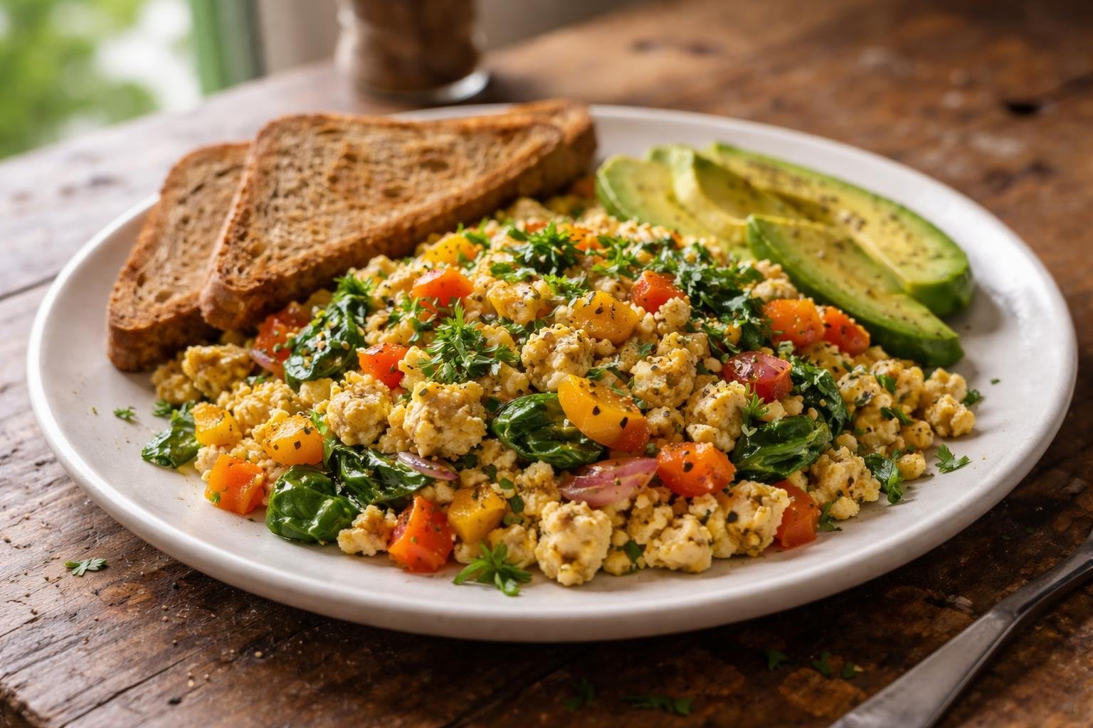 This tofu scramble pairs beautifully with whole-grain toast and creamy avocado slices.