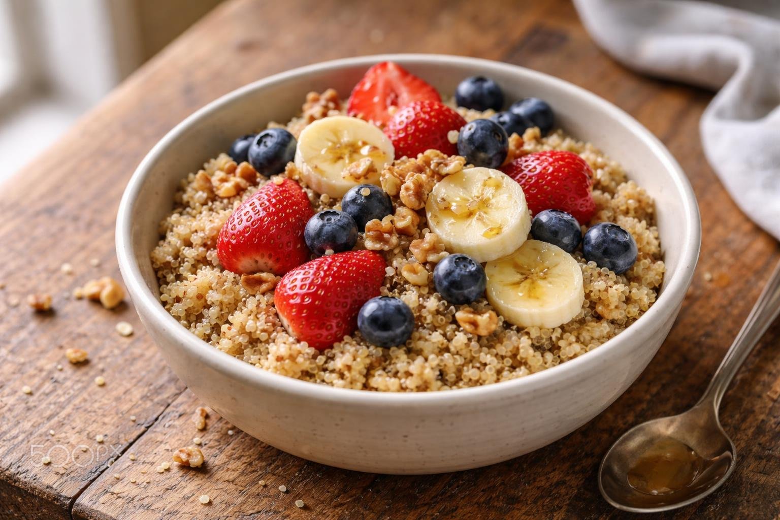 The foundation of this breakfast bowl is fluffy quinoa, which is cooked in almond milk for added creaminess. The combination of quinoa with fresh fruits like strawberries, blueberries, and bananas creates a colorful and inviting presentation.
