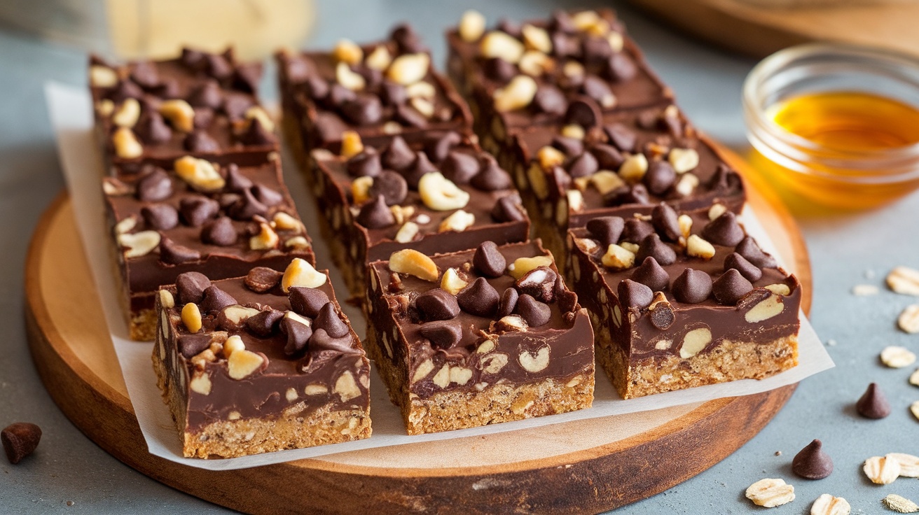 For an inviting presentation, arrange the cut bars on a wooden board, showcasing their rich texture and studded chocolate chips.