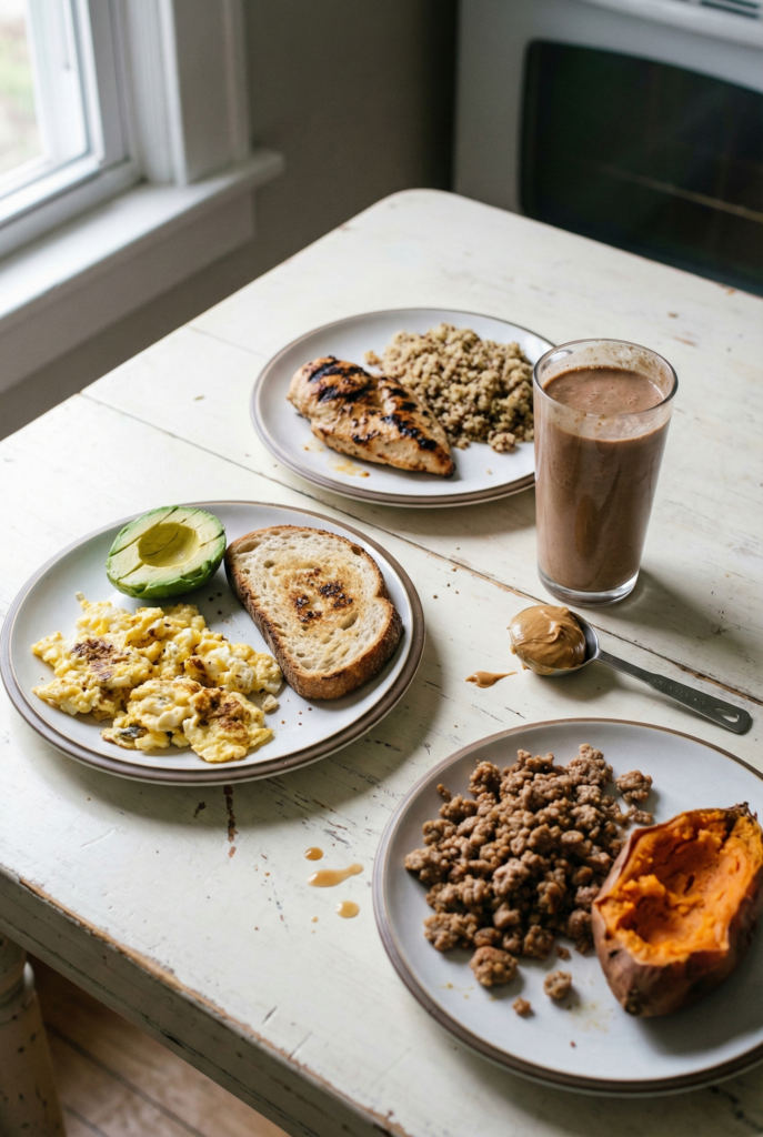 SnackProtein Smoothie (Oat Milk, Banana, Whey)30g400Calorie-dense but easy to sip.