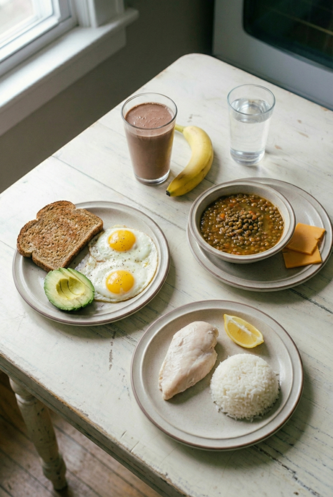 BreakfastOvernight Oats (1 cup) + 1 scoop Whey35g450Cold and low-odor for sensitivity.