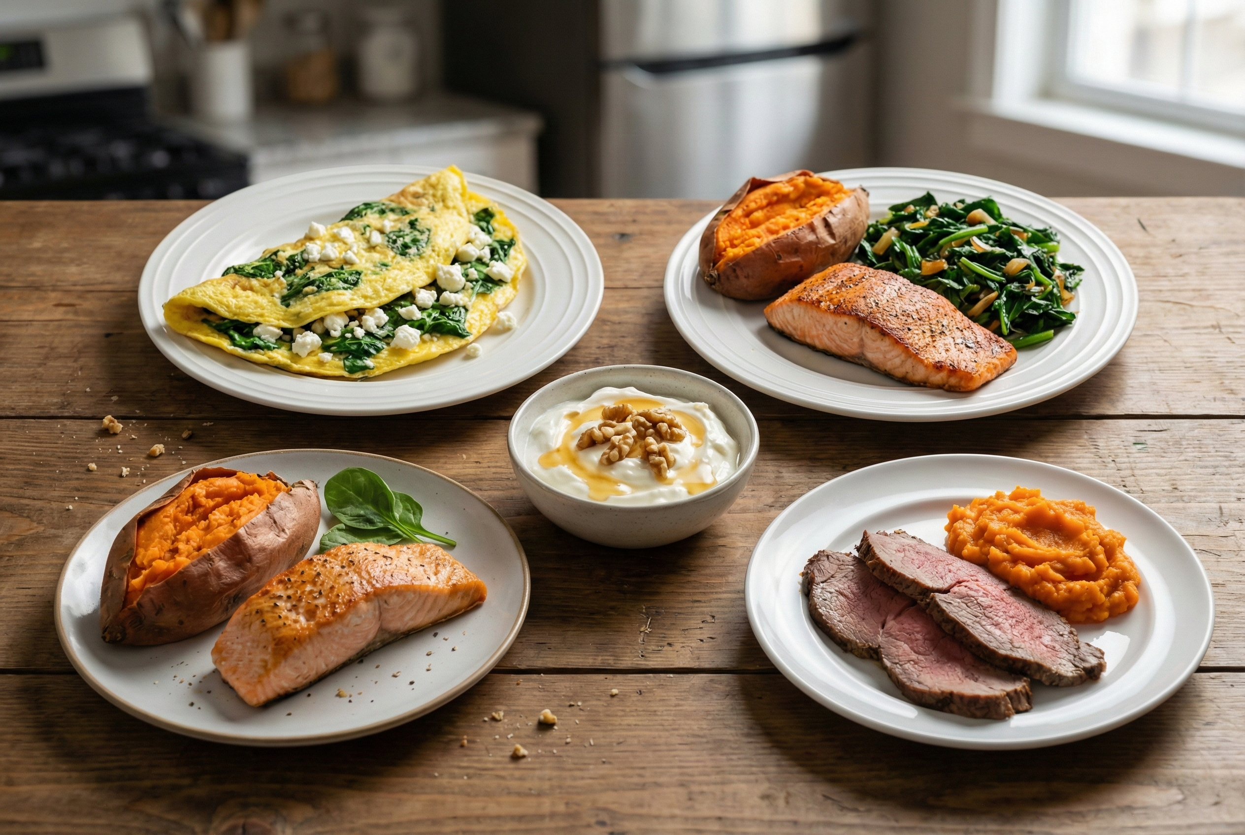 • Protein Staples: Whey isolate, Greek yogurt, canned tuna, shrimp, and eggs.