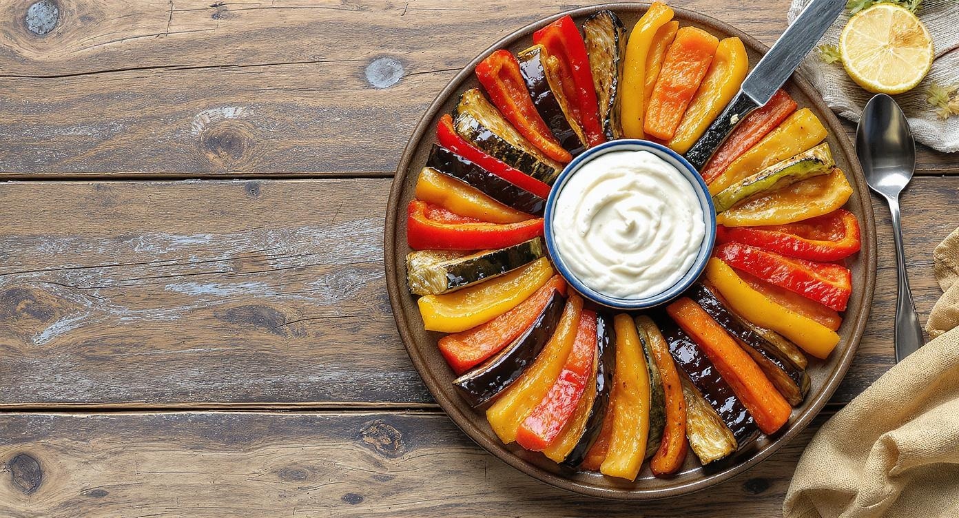 - Once the vegetables are done, let them cool slightly before arranging them on a platter. Serve with the yogurt dip in the center.
